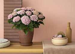 Deze kamerhortensia is met recht een revolutie op hortensia gebied te noemen. Voel de bloemen maar eens! Die zijn heel stevig en zullen daarom lang blijven staan.