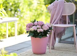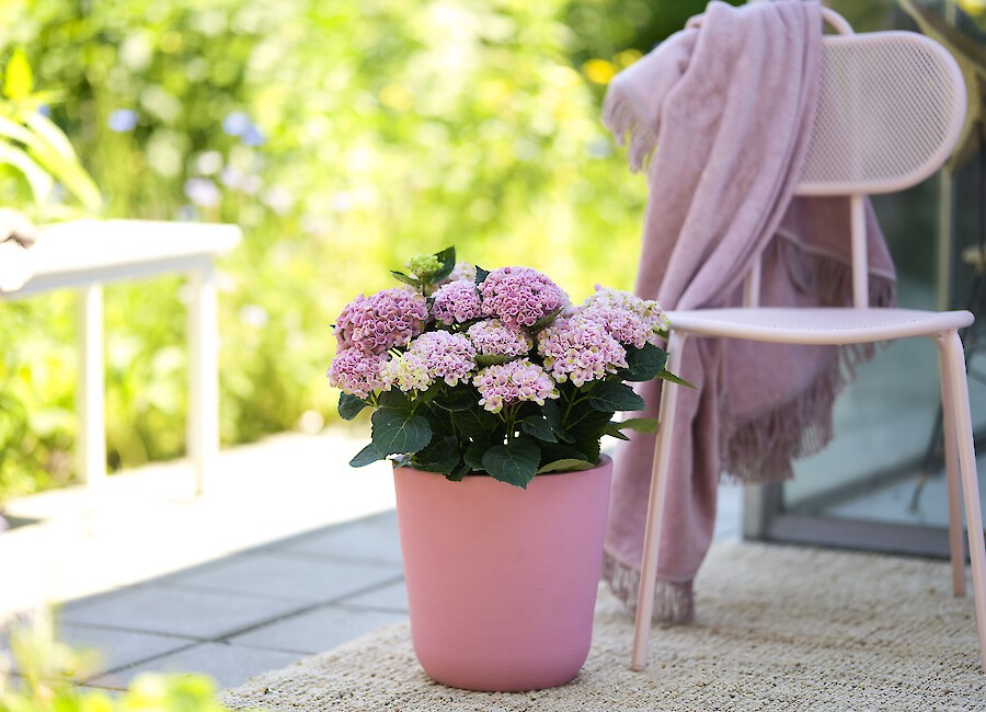 De Magical Revolution is een compacte hortensia met roze of blauwe bollen vol kleine bloemetjes op stevige takken, die binnen een paar maanden doorkleuren naar prachtig dieprood.